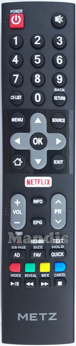 Power, Mute, 1, 2, 3, 4, 5, 6, 7, 8, 9, 0, CH List, Return / Back, Menu, Source, Exit, Home, Up, Down, Right, Left, OK, Netflix, Vol +, Vol -, Info, EPG, PR +, PR -, Rec, NICAM I/II, Text, AD / Sub-Page, FAV / Size, Quick / Hold, Red, Green, Yellow, Blue, Play/Pause / Index, << / Reveal, Mix / >>, Stop / Cancel