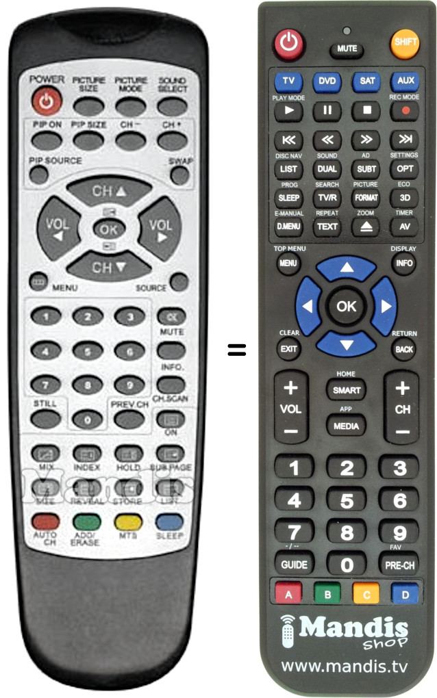 Este controle remoto executa todas as funções do controle remoto original: Power, Picture Size, Picture Mode, Sound Select, PIP On, PIP Size, PIP CH-, PIP CH+, PIP Source, PIP Swap, Up / CH+, Down / CH-, Right / Vol+, Left / Vol-, OK, Menu, Source, 1, 2, 3, 4, 5, 6, 7, 8, 9, 0, Still, Prev. CH, Mute, Info, CH. Scan, Text On, Text Mix, Text Index, Text Hold, Text Sub Page, Text Size, Text Reveal, Text Store, Text List, Red / Auto CH, Green / Add/Erase, Yellow / MTS, Blue / Sleep