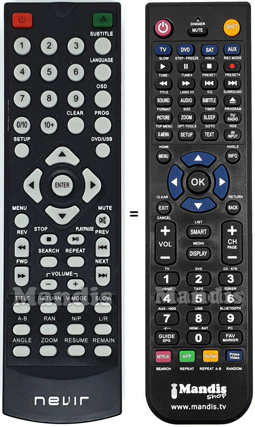 Abaixo, mostraremos a correspondência entre cada botão no controle remoto original e o botão que executa a mesma função no controle remoto de substituição. Em alguns casos, pode ser necessário pressionar a tecla SHIFT antes de pressionar outro botão para realizar determinadas ações. Essas funções adicionais geralmente não são amplamente utilizadas e são incluídas para facilitar o entendimento do controle remoto de substituição, ou porque o controle remoto original tem mais botões do que seu equivalente.