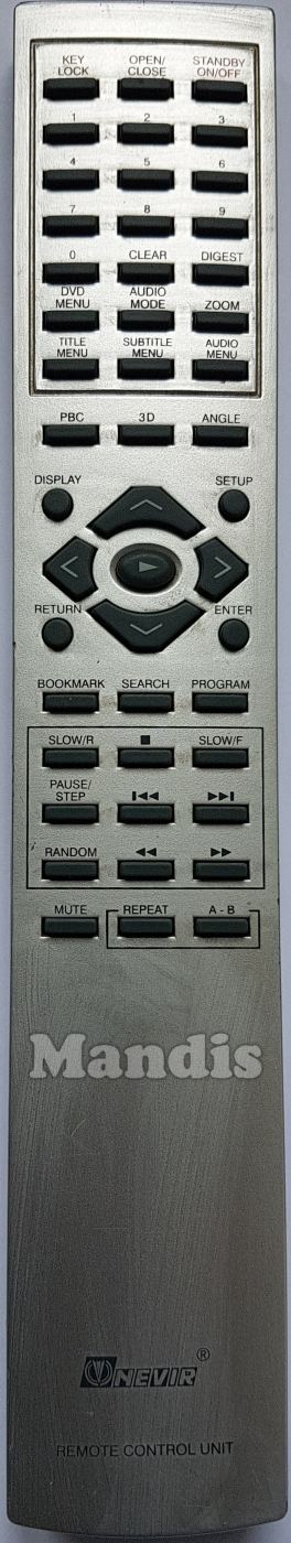 KEY LOCK, OPEN/CLOSE, STANBY ON/OFF, 1, 2, 3, 4, 5, 6, 7, 8, 9, 0, CLEAR, DIGEST, DVD MENU, AUDIO MODE, ZOOM, TITLE MENU, SUBTITLE MENU, AUDIO MENU, PBC, 3D, ANGLE, DISPLAY, SETUP, RETURN, ENTER, ON, UP, DOWN, RIGHT, LEFT, BOOKMARK, SEARCH, PROGRAM, SLOW/R, STOP, SLOW/F, PAUSE/STEP, I<<, >>I, RANDOM, <<, >>, MUTE, REPEAT, A-B
