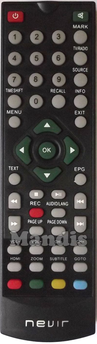 Power, Mute, 1, 2, 3, 4, 5, 6, 7, 8, 9, 0, Mark, TV / Radio, Source, Timeshift, Recall, Info, Menu, Exit, Up, Down, Right, Left, OK, , , <<, >>, Stop, Play / Pause, I<<, >>I, Rec, Audio / Lang, Page Up, Page Down, Vol -, Vol +, CH -, CH +, HDMI, Zoom, Subtitle, Goto, Red, Green, Yellow, Blue