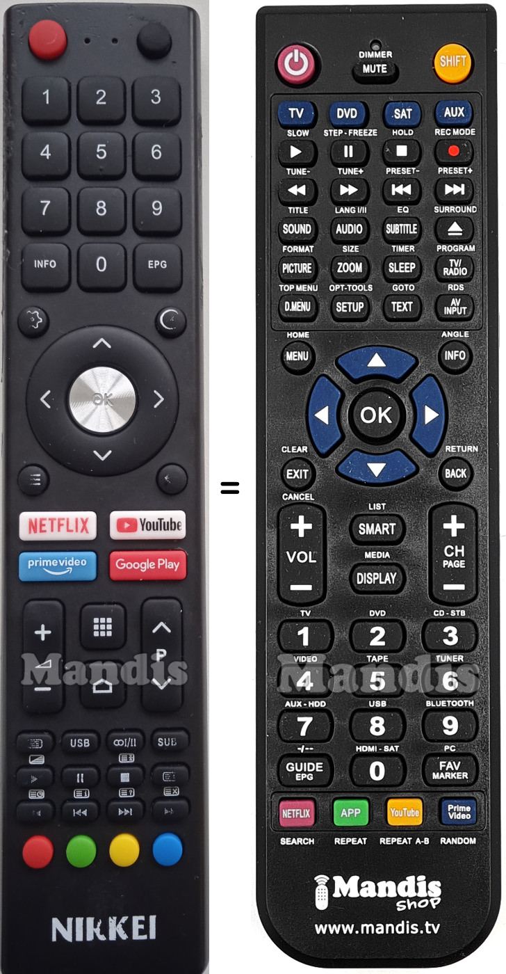 Abaixo, mostraremos a correspondência entre cada botão no controle remoto original e o botão que executa a mesma função no controle remoto de substituição. Em alguns casos, pode ser necessário pressionar a tecla SHIFT antes de pressionar outro botão para realizar determinadas ações. Essas funções adicionais geralmente não são amplamente utilizadas e são incluídas para facilitar o entendimento do controle remoto de substituição, ou porque o controle remoto original tem mais botões do que seu equivalente.