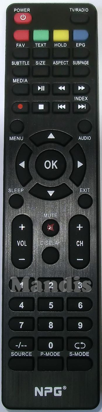 Power, TV / Radio, Red, Green, Yellow, Blue, FAV, Text, Hold, EPG, Subtitle, Size, Aspect, Subpage, Media, Play / Pause, <<, >>, Rec, Stop, I<<, >>I, Menu, Audio, Up, Down, Right, Left, Sleep, Exit, Vol +, Vol +, CH +, CH -, Mute, Display, OK, 1, 2, 3, 4, 5, 6, 7, 8, 9, 0, -/--, Recakk, Source, P-Mode, S-Mode