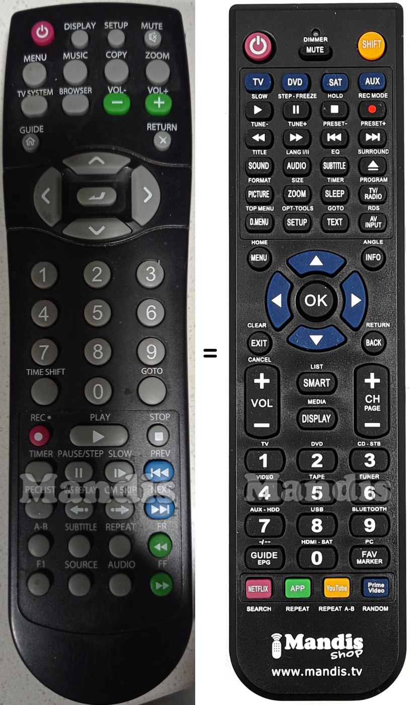 Abaixo, mostraremos a correspondência entre cada botão no controle remoto original e o botão que executa a mesma função no controle remoto de substituição. Em alguns casos, pode ser necessário pressionar a tecla SHIFT antes de pressionar outro botão para realizar determinadas ações. Essas funções adicionais geralmente não são amplamente utilizadas e são incluídas para facilitar o entendimento do controle remoto de substituição, ou porque o controle remoto original tem mais botões do que seu equivalente.