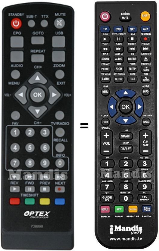 Abaixo, mostraremos a correspondência entre cada botão no controle remoto original e o botão que executa a mesma função no controle remoto de substituição. Em alguns casos, pode ser necessário pressionar a tecla SHIFT antes de pressionar outro botão para realizar determinadas ações. Essas funções adicionais geralmente não são amplamente utilizadas e são incluídas para facilitar o entendimento do controle remoto de substituição, ou porque o controle remoto original tem mais botões do que seu equivalente.