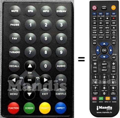 Mute, EPG, Info, DVB/AV, Pause, Fav, TV/Radio, 1, 2, 3, 4, 5, 6, 7, 8, 9, 0, Recall, Audio, TTX, Menu, Exit, Subtitle, Up / CH+, Down / CH-, Right / Vol+, Left / Vol-, OK, Red / Function, Green / Screen, Yellow / Speaker, Blue / Aspect