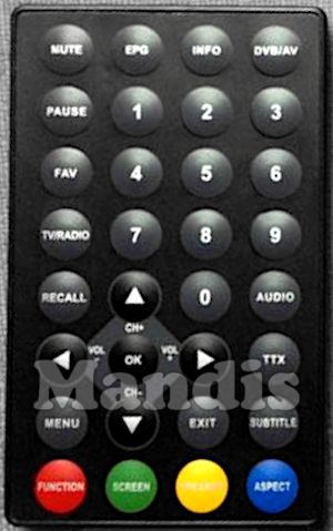 Mute, EPG, Info, DVB/AV, Pause, Fav, TV/Radio, 1, 2, 3, 4, 5, 6, 7, 8, 9, 0, Recall, Audio, TTX, Menu, Exit, Subtitle, Up / CH+, Down / CH-, Right / Vol+, Left / Vol-, OK, Red / Function, Green / Screen, Yellow / Speaker, Blue / Aspect