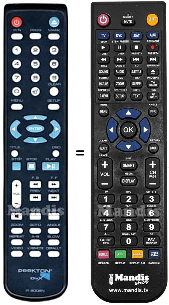 Abaixo, mostraremos a correspondência entre cada botão no controle remoto original e o botão que executa a mesma função no controle remoto de substituição. Em alguns casos, pode ser necessário pressionar a tecla SHIFT antes de pressionar outro botão para realizar determinadas ações. Essas funções adicionais geralmente não são amplamente utilizadas e são incluídas para facilitar o entendimento do controle remoto de substituição, ou porque o controle remoto original tem mais botões do que seu equivalente.