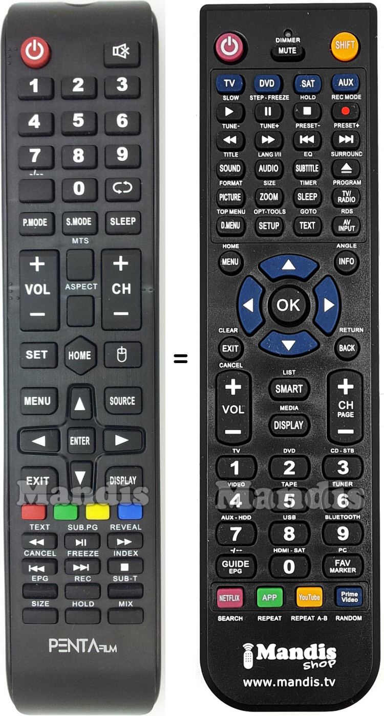Abaixo, mostraremos a correspondência entre cada botão no controle remoto original e o botão que executa a mesma função no controle remoto de substituição. Em alguns casos, pode ser necessário pressionar a tecla SHIFT antes de pressionar outro botão para realizar determinadas ações. Essas funções adicionais geralmente não são amplamente utilizadas e são incluídas para facilitar o entendimento do controle remoto de substituição, ou porque o controle remoto original tem mais botões do que seu equivalente.