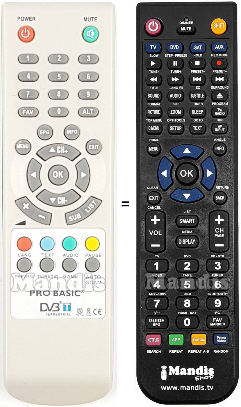 Abaixo, mostraremos a correspondência entre cada botão no controle remoto original e o botão que executa a mesma função no controle remoto de substituição. Em alguns casos, pode ser necessário pressionar a tecla SHIFT antes de pressionar outro botão para realizar determinadas ações. Essas funções adicionais geralmente não são amplamente utilizadas e são incluídas para facilitar o entendimento do controle remoto de substituição, ou porque o controle remoto original tem mais botões do que seu equivalente.