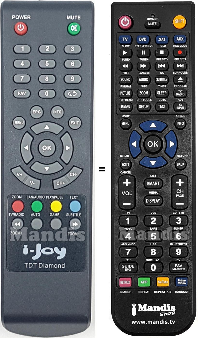 Abaixo, mostraremos a correspondência entre cada botão no controle remoto original e o botão que executa a mesma função no controle remoto de substituição. Em alguns casos, pode ser necessário pressionar a tecla SHIFT antes de pressionar outro botão para realizar determinadas ações. Essas funções adicionais geralmente não são amplamente utilizadas e são incluídas para facilitar o entendimento do controle remoto de substituição, ou porque o controle remoto original tem mais botões do que seu equivalente.