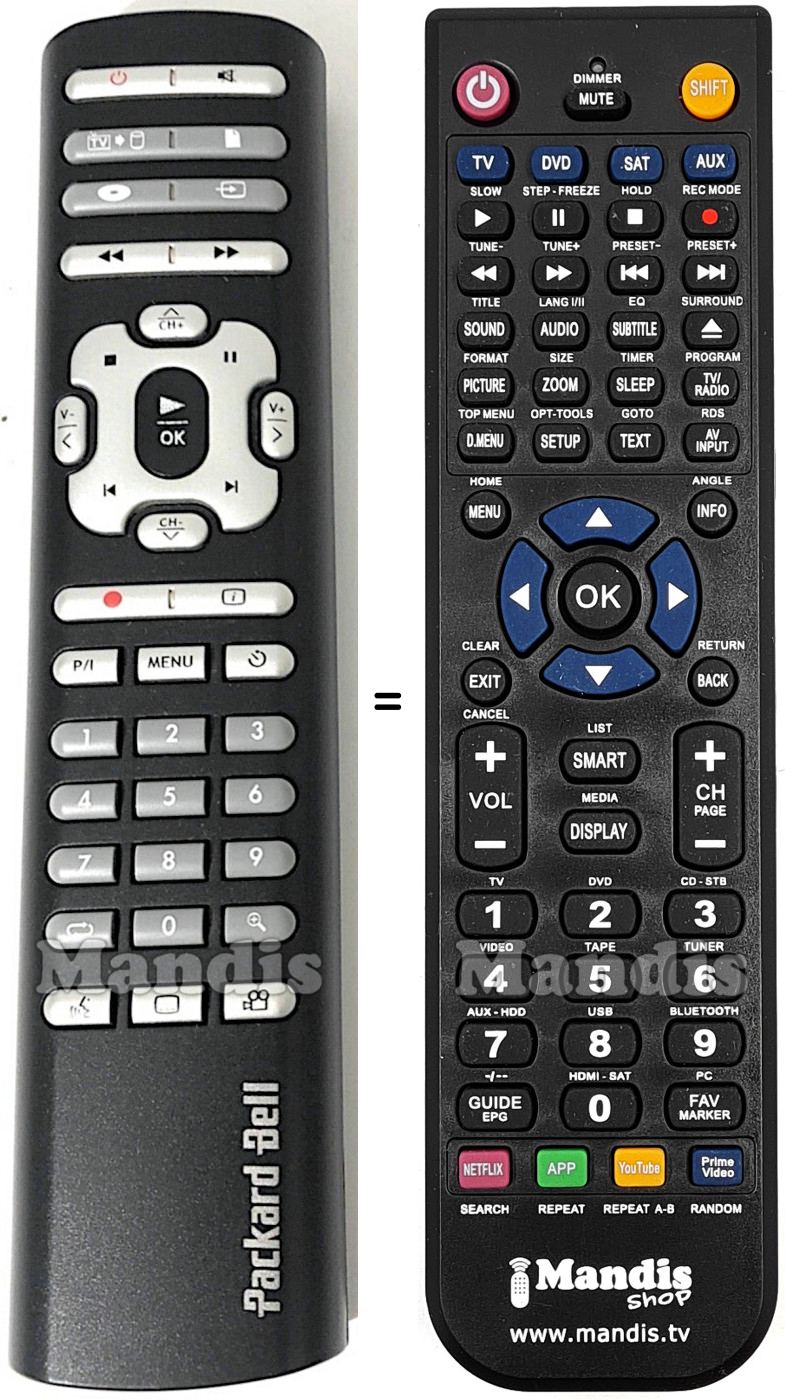 Abaixo, mostraremos a correspondência entre cada botão no controle remoto original e o botão que executa a mesma função no controle remoto de substituição. Em alguns casos, pode ser necessário pressionar a tecla SHIFT antes de pressionar outro botão para realizar determinadas ações. Essas funções adicionais geralmente não são amplamente utilizadas e são incluídas para facilitar o entendimento do controle remoto de substituição, ou porque o controle remoto original tem mais botões do que seu equivalente.