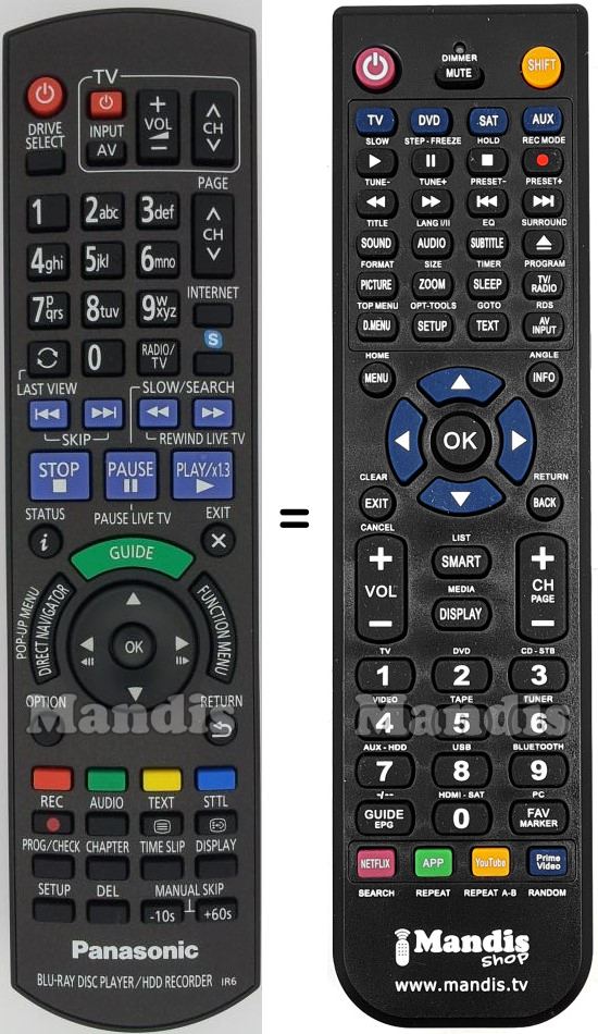 Abaixo, mostraremos a correspondência entre cada botão no controle remoto original e o botão que executa a mesma função no controle remoto de substituição. Em alguns casos, pode ser necessário pressionar a tecla SHIFT antes de pressionar outro botão para realizar determinadas ações. Essas funções adicionais geralmente não são amplamente utilizadas e são incluídas para facilitar o entendimento do controle remoto de substituição, ou porque o controle remoto original tem mais botões do que seu equivalente.
