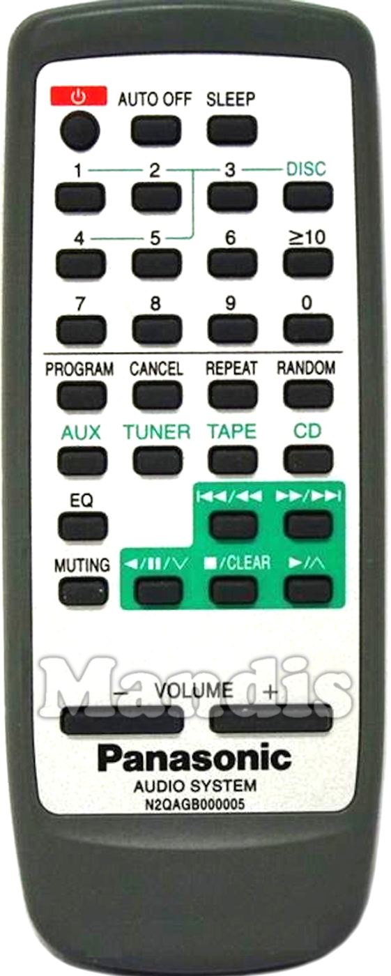 Comando à distância original N2QAGB000005 que serve para sistema hi-fi da marca Panasonic. Trata-se de um modelo original de comando à distância.