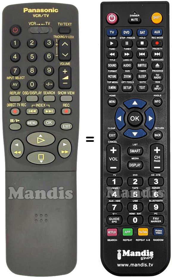 Este controle remoto executa todas as funções do controle remoto original: Power, Tv/Text, 1, 2, 3, 4, 5, 6, 7, 8, 9, 0, AV/Input Select, Tracking/V-Lock+, Tracking/V-Lock-, Vol+, Vol-, -/--, Replay, OSD/Display, Search, Show View, Direct Tv Rec, I<<, >>I, Rec, Pause/Step, Menu, OK, Exit, Play/Up, Stop/Down, >>/Right, <</Left, Prog/Check+, Prog/Check-, Date+, Date-, On+, On-, Off+, Off-, Prog/Check, Cancel, Nothing1, Timer Rec, Reset, Nothing2, Nothing3, VPS/PDC, AV Link, Tv Aspect