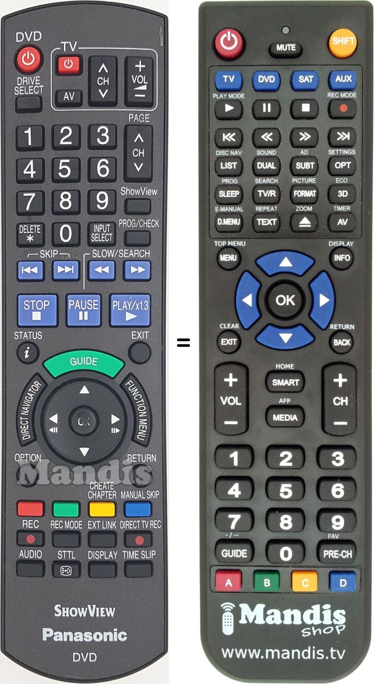 Este controle remoto executa todas as funções do controle remoto original: DVD Power, Drive Select, TV Power, TV AV, TV CH +, TV CH -, TV Vol +, TV Vol -, 1, 2, 3, 4, 5, 6, 7, 8, 9, 0, Delete *, Input Select, CH + / Page +, CH - / Page -, ShowView, Prog / Check, I<< Skip, Skip >>I, << Search, Search >>, Stop, Pause / Slow, Play / x1.3, i / Status, Exit, Guide, Direct Navigator, Function Menu, Up, Down, Right / II>, Left / <II, OK, Option, Return, Red, Green, Yellow / Create Chapter, Blue / Manual Skip, Rec, Rec Mode, Ext Link, Direct TV Rec, Audio, STTL, Display, Time Slip