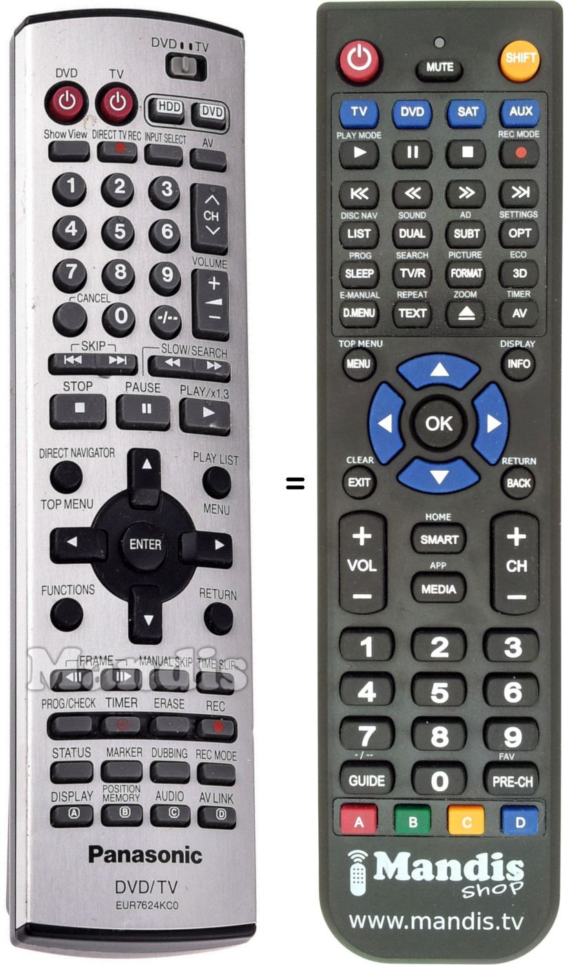 Este controle remoto executa todas as funções do controle remoto original: Power DVD, Power TV, HDD, DVD, Show View, Direct TV Rec, Input Select, AV, 1, 2, 3, 4, 5, 6, 7, 8, 9, 0, -/--, Cancel, CH+, CH-, Volume+, Volume-, I<< Skip, Skip >>I, << Slow/Search, Slow/Search >>, Stop, Pause, Play / x1.3, Direct Navigator / Top Menu, Play List / Menu, Up, Left, Enter, Right, Down, Functions, Return, <II Frame, Frame II>, Manual Skip, Time Slip, Prog/Check, Timer, Erase, Rec, Status, Marker, Dubbing, Rec Mode, A / Display, B / Position Memory, C / Audio, D / AV Link