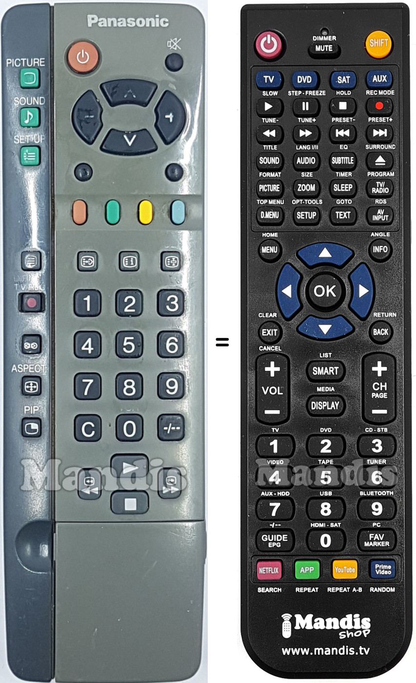 Abaixo, mostraremos a correspondência entre cada botão no controle remoto original e o botão que executa a mesma função no controle remoto de substituição. Em alguns casos, pode ser necessário pressionar a tecla SHIFT antes de pressionar outro botão para realizar determinadas ações. Essas funções adicionais geralmente não são amplamente utilizadas e são incluídas para facilitar o entendimento do controle remoto de substituição, ou porque o controle remoto original tem mais botões do que seu equivalente.