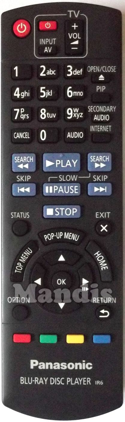Power, TV Power, TV AV/Input, TV Vol +, TV Vol -, 1, 2, 3, 4, 5, 6, 7, 8, 9, 0, Cancel, Audio, Open / Close, PIP, Secondary Audio, Internet, << / Search -, Play, >> / Search +, I<< / Skip -, Pause / Slow, >>I / Skip +, Stop, Status, Exit, Pop-Up Menu, Top Menu, Home, Up, Left, OK, Right / II>, Down, Option, Return, Red, Green, Yellow, Blue