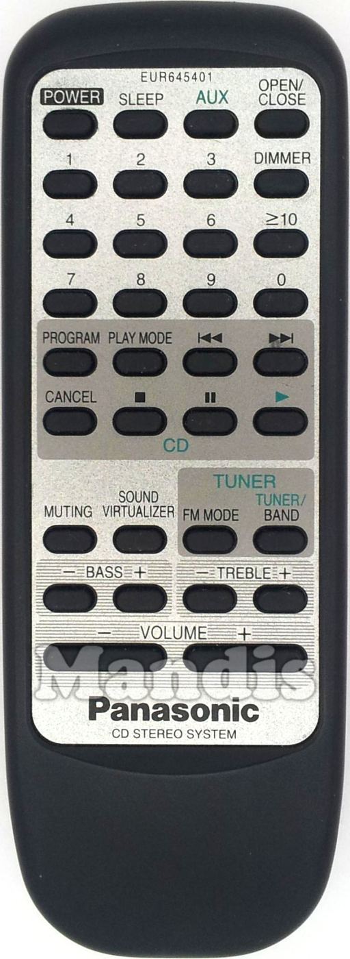 Comando à distância original EUR645401 que serve para sistema hi-fi da marca Panasonic. Trata-se de um modelo original de comando à distância.