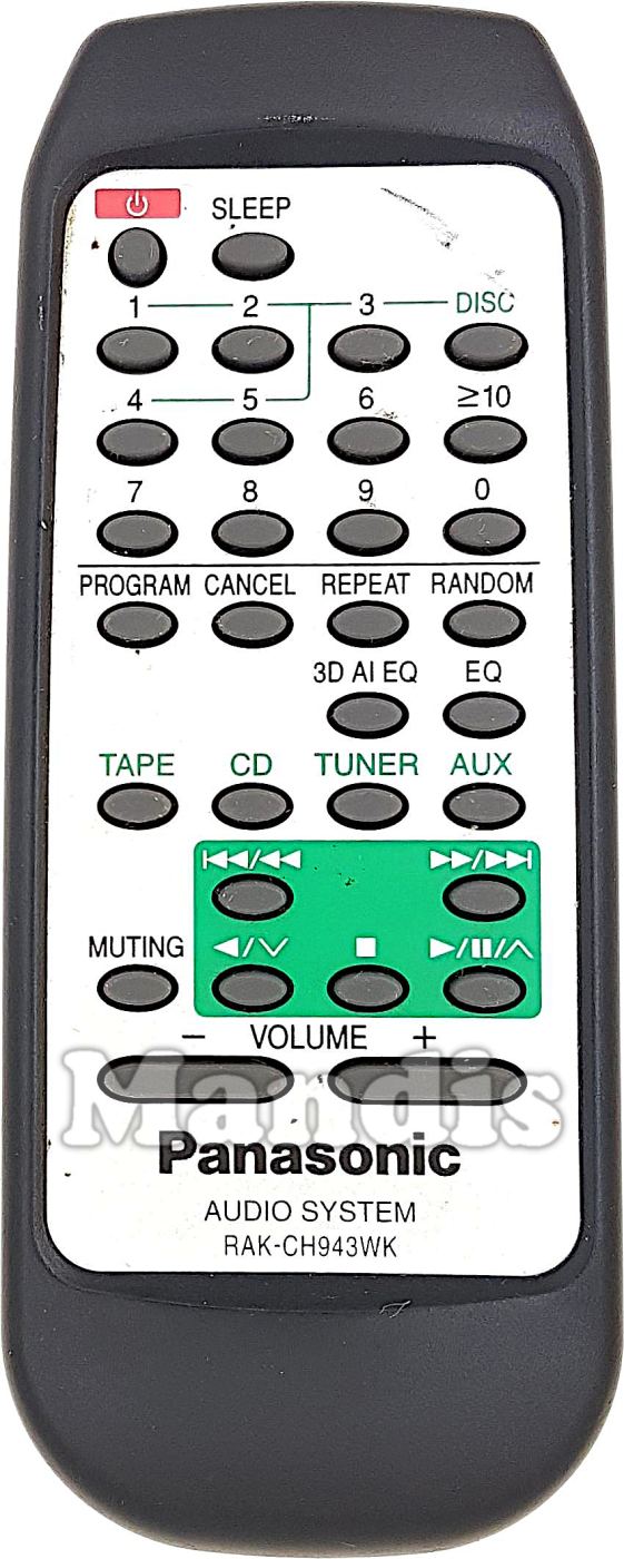Comando à distância original RAK-CH943WK que serve para sistema hi-fi da marca Panasonic. Trata-se de um modelo original de comando à distância.