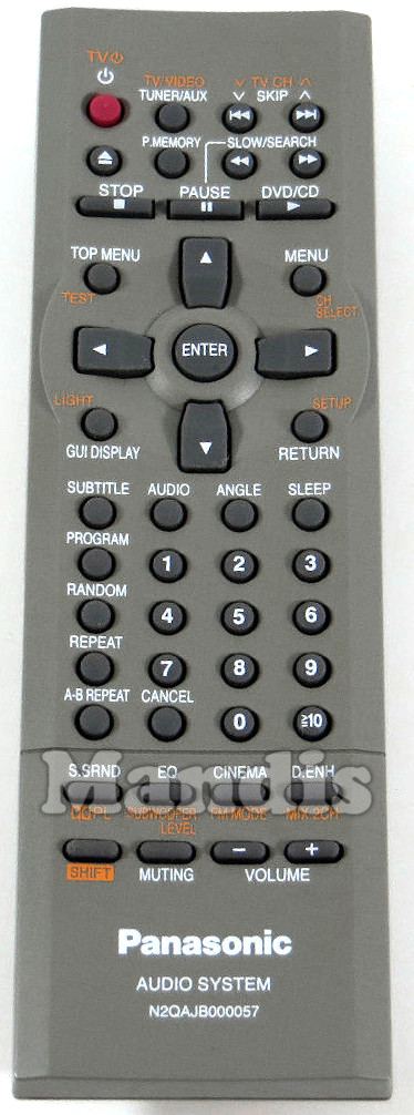 Power / TV Power, Tuner/Aux/ TV/Video, I<< / Skip - / TV CH -, >>I / Skip + / TV CH +, Eject, P.Memory, << / Slow/Search -, >> / Slow/Search +, Stop, Pause, DVD/CD Play, Top Menu / Test, Menu / CH Select, Up, Left, Enter, Right, Down, GUI Display / Light, Return / Setup, Subtitle, Audio, Angle, Sleep, Program, Random, Repeat, A-B Repeat, 1, 2, 3, 4, 5, 6, 7, 8, 9, 0, ≧10, Cancel, S.SRND / Dolby PL, EQ / Subwoofer Level, Cinema / FM Mode, D.ENH / Mix 2CH, Shift, Muting, Volume -, Volume +