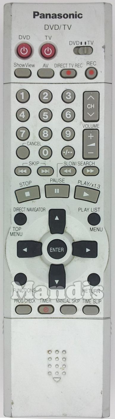 Power DVD, Power TV, Show View, AV, Direct TV Rec, Rec, 1, 2, 3, 4, 5, 6, 7, 8, 9, Cancel, 0, -/--, CH+, CH-, Vol-, Vol-, I<<, >>I, <<, >>, Stop, Pause, Play/x1.3, Direct Navigator/Top Menu, Play List/Menu, Up, Down, Left, Right, Enter, Functions, Return, Prog/Check, Timer, Manual Skip, Time Slip, F.Rec, Rec Mode, <II Frame, II> Frame, Input Select, Status, AV.Link, Display, Erase, Audio, Position Memory, Maker