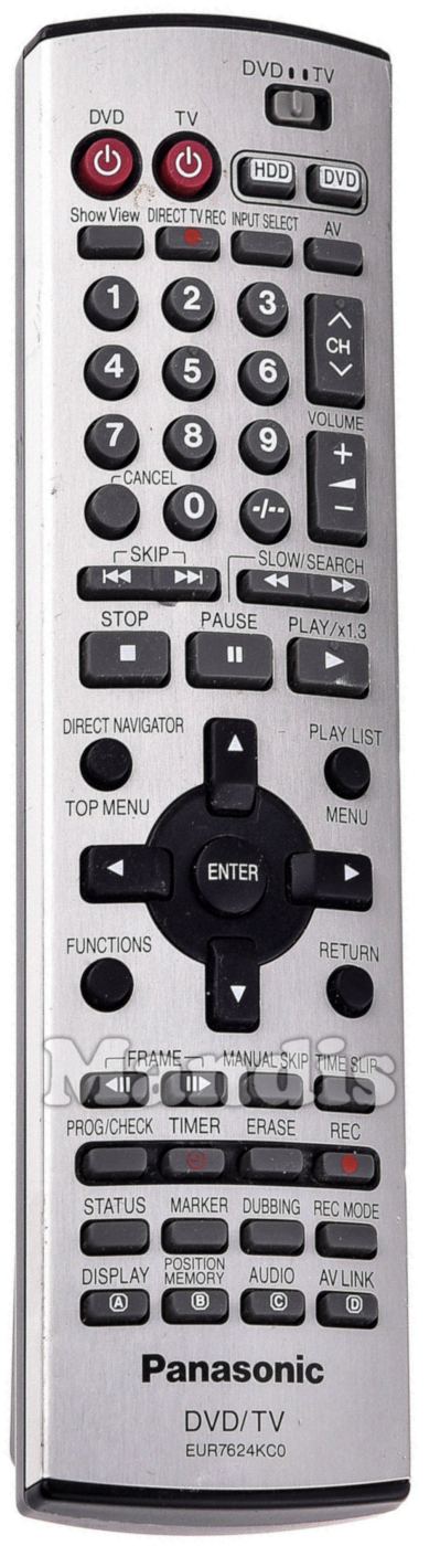 Power DVD, Power TV, HDD, DVD, Show View, Direct TV Rec, Input Select, AV, 1, 2, 3, 4, 5, 6, 7, 8, 9, 0, -/--, Cancel, CH+, CH-, Volume+, Volume-, I<< Skip, Skip >>I, << Slow/Search, Slow/Search >>, Stop, Pause, Play / x1.3, Direct Navigator / Top Menu, Play List / Menu, Up, Left, Enter, Right, Down, Functions, Return, <II Frame, Frame II>, Manual Skip, Time Slip, Prog/Check, Timer, Erase, Rec, Status, Marker, Dubbing, Rec Mode, A / Display, B / Position Memory, C / Audio, D / AV Link