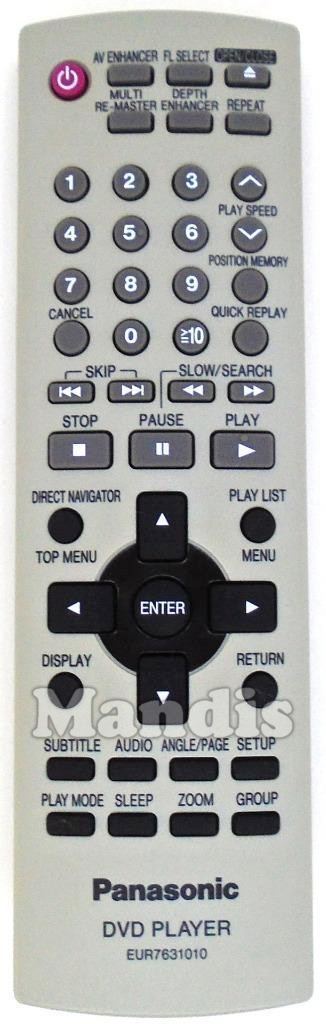 Power, AV Enhancer, FL Select, Open / Close, Multi Re-Master, Depth Enhancer, Repeat, 1, 2, 3, 4, 5, 6, 7, 8, 9, 0, ≧10, Cancel, ᐱ Play Speed +, ᐯ Play Speed -, Position Memory, Quick Replay, ▮◀◀ Skip, ▶▶▮ Skip, ◀◀ Slow/Search, ▶▶ Slow/Search, ◼ Stop, ▮▮ Pause, ▶ Play, Direct Navigator / Top Menu, Play List / Menu, Up, Left, Enter, Right, Down, Display, Return, Subtitle, Audio, Angle / Page, Setup, Play Mode, Sleep, Zoom, Group