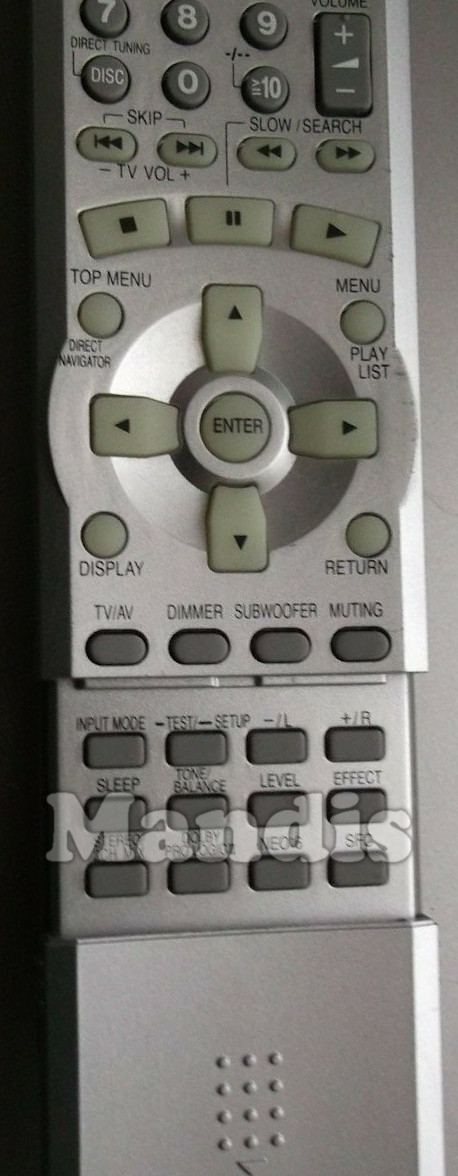 Power Receiver, Power AV System, DVD, TV, TUNER BAND, TAPE, CD, VCR, 1, 2, 3, 4, 5, 6, 7, 8, 9, Disc / Direct Tuning, 0, ≧10 / -/--, CH+, CH-, Volume+, Volume-, I<< / I<< Skip, Skip >>I / TV Vol+, << Slow/Search, Slow/Search >>, Stop, Pause, Play, Top Menu / Direct Navigator, Menu / Play List, Up, Left, Enter, Right, Down, Display, Return, TV/AV, Dimmer, Subwoofer, Muting, Input Mode, Test / Setup, -/L, +/R, Sleep, Tone / Balance, Level, Effect, Stereo / 2CH Mix, Dolby Pro Logic II, NEO 6, SFC