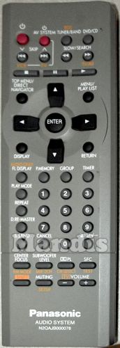 Power, AV System Power, Tuner/Band / RDS, DVD / CD, I<< Skip / VCR, Skip >>I / TV, << Slow/Search, Slow/Search >> / TV/AV, Stop, Pause, Play, Top Menu / Direct Navigator, Up, Menu / Play List, Left, Enter, Right, Down, Display, Return, FL Display / Audio Only, P.Memory, Group, Timer, Play Mode, Repeat, D.Re-Master, S,SRND, 1, 2, 3, 4, 5, 6, 7, 8, 9, 0, ≧10 / -/--, Cancel, Center Focus / FM Mode, Subwoofer Level / Mix 2CH, Dolby Digital PL / CH Select, SFC / Test, Shift, Muting / Setup, Volume- / TV Vol-, Volume+ / TV Vol+