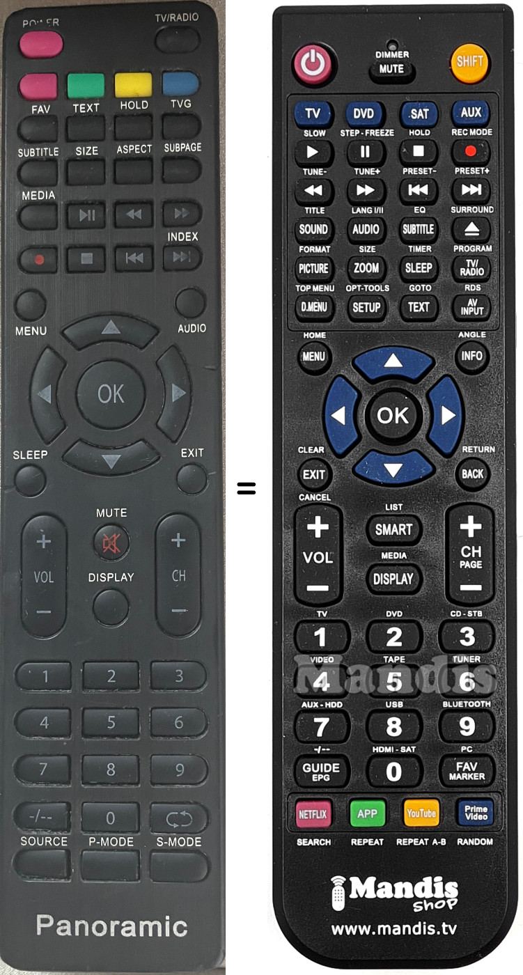 Abaixo, mostraremos a correspondência entre cada botão no controle remoto original e o botão que executa a mesma função no controle remoto de substituição. Em alguns casos, pode ser necessário pressionar a tecla SHIFT antes de pressionar outro botão para realizar determinadas ações. Essas funções adicionais geralmente não são amplamente utilizadas e são incluídas para facilitar o entendimento do controle remoto de substituição, ou porque o controle remoto original tem mais botões do que seu equivalente.