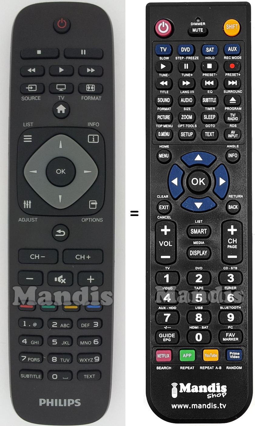 Abaixo, mostraremos a correspondência entre cada botão no controle remoto original e o botão que executa a mesma função no controle remoto de substituição. Em alguns casos, pode ser necessário pressionar a tecla SHIFT antes de pressionar outro botão para realizar determinadas ações. Essas funções adicionais geralmente não são amplamente utilizadas e são incluídas para facilitar o entendimento do controle remoto de substituição, ou porque o controle remoto original tem mais botões do que seu equivalente.