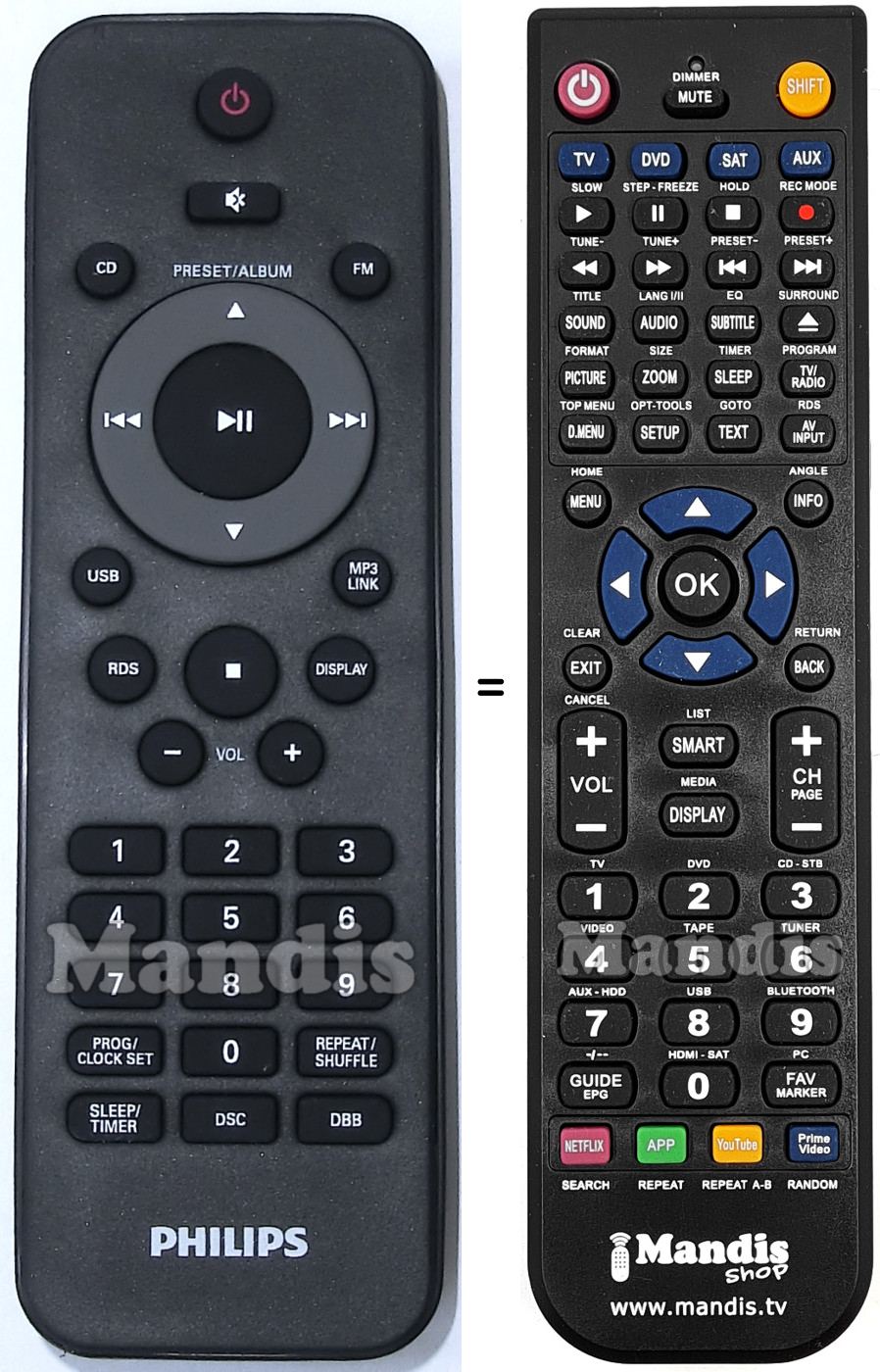 Power, Mute, Preset/Album Up, Preset/Album Down, >>I, I<<, Play/Pause, RDS, Display, Vol+, Vol-, Stop, 1, 2, 3, 4, 5, 6, 7, 8, 9, Prog/Clock Set, 0, Repeat/Shuffle, Sleep/Timer, DSC, DBB