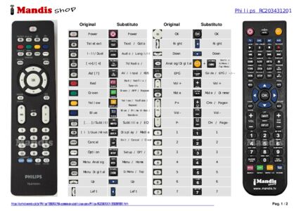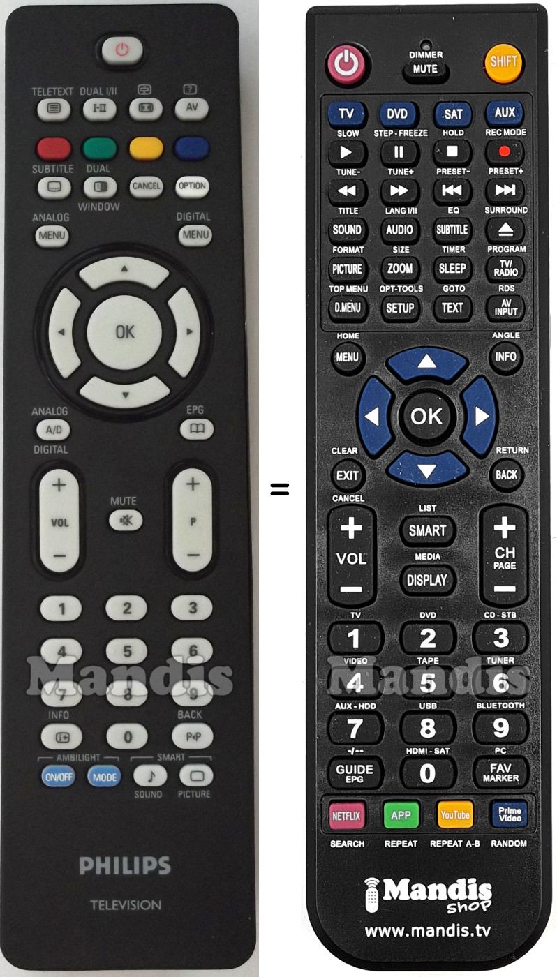 Este controle remoto executa todas as funções do controle remoto original: Power, Teletext, Dual I / II, , AV, Red, Geen, Yellow, Blue, Subtitle, Dual Window, Cancel, Option, Menu Analog, Menu Digital, Up, Right, Down, Left, OK, Analog / Digital, EPG, Vol +, Vol -, Mute, P +, P -, 1, 2, 3, 4, 5, 6, 7, 8, 9, 0, Info, P<P / Back, Ambilight ON/OFF, Ambilight Mode, Sound, Picture