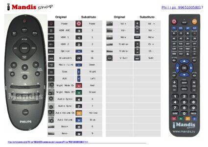 Este controle remoto executa todas as funções do controle remoto original: Power, HDMI ARC, HDMI 1, HDMI 2, Up / Optical, Right / Coax, Down / Music iLink, Left / Aux, OK / Bluetooth, Night Mode On, Night Mode Off, Audio Sync +, Audio Sync -, Auto Volume On, Auto Volume Off, Volume -, Mute, Volume +, Treble -, Treble +, Bass -, Bass +, V.Surr
