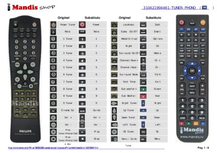 Este controle remoto executa todas as funções do controle remoto original: Power, Mute, Phono, Tuner, CD, CDR / Tape, TV, VCR, SAT, DVD, 1, 2, 3, 4, 5, 6, 7, 8, 9, 0, Cinema Go, Cable Box, Menu / Guide, OK, Up, Right, Down, Left, Vol +, Vol -, i / News / TA, Play / TV Vol +, Stop / TV Vol -, I<, >I, Loudness, Subw On / Off, Audio / Rec, Cancel, Pause / FR.D., T-C / Index, Disc / DVD, Night, Mode / Virtual, Surround On / Off, Sub Woofer +, Sub Woofer -, Rear + / Channel +, Rear - / Channel -, Surround Mode, Test Tone