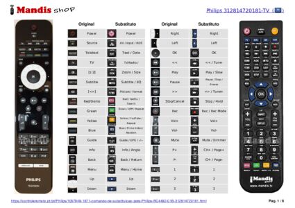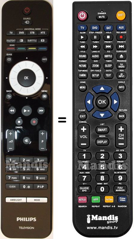 Este controle remoto executa todas as funções do controle remoto original: Power, Source, TV, DVD, STB, HTS, Teletext, [1|2], Subtitle, Format, Red / Demo, Green, Yellow, Blue, Guide, Info, Up, Right, Down, Left, OK, Back, Menu, <<, Play / Pause, >>, Stop / Cancel, Rec, Vol +, Vol -, Mute, P +, P -, 1, 2, 3, 4, 5, 6, 7, 8, 9, 0, Clock, P↔P, Ambilight, Mode
