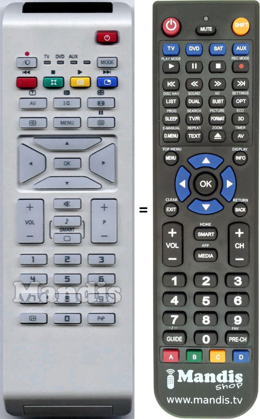 Este controle remoto executa todas as funções do controle remoto original: Power, O / Rec, Mode, Red / I<<, Green / [[ ]] / Stop, Yellow / List / Play, Blue / PIP / >>I, AV / [?], I-II / [≡I≡], Aspect, [-O-], Menu, Text / Pause, Up, Right, Down, Left, OK, Vol +, Vol -, Mute, Smart Audio ♪, Smart Picture ▢, P +, P -, 1, 2, 3, 4, 5, 6, 7, 8, 9, 0, [i+], P < P