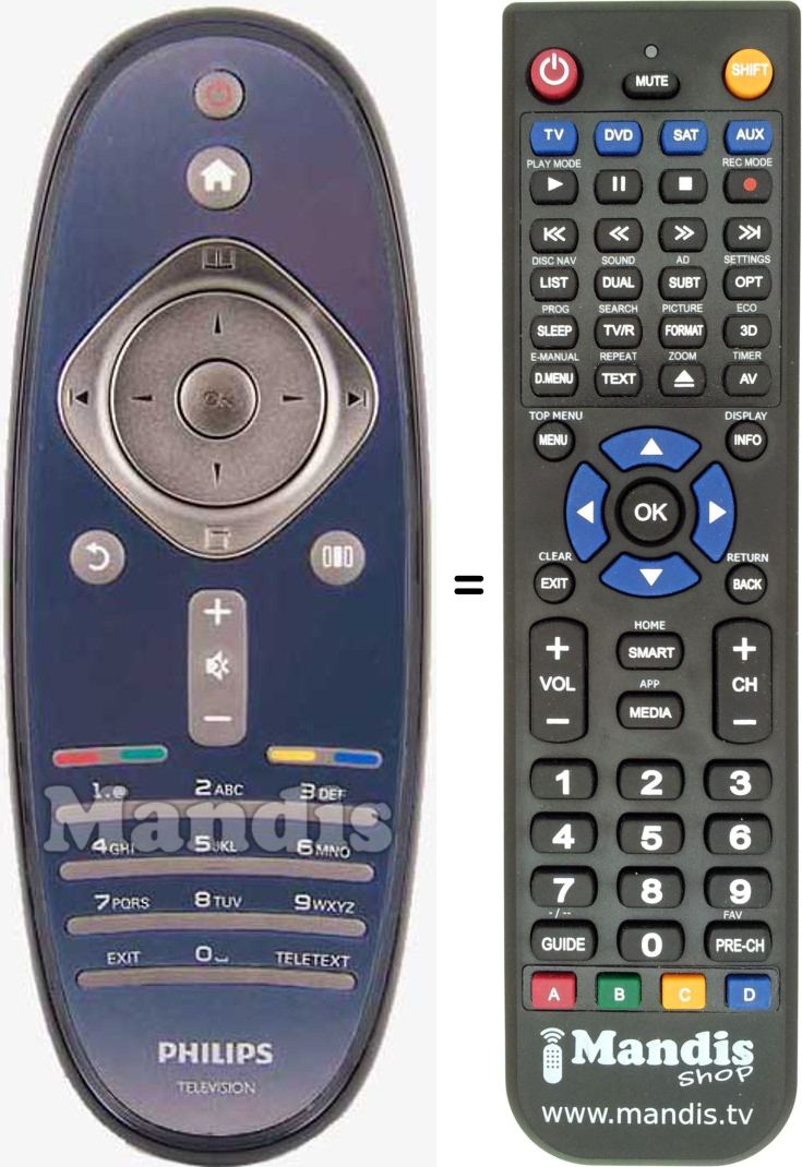 Abaixo, mostraremos a correspondência entre cada botão no controle remoto original e o botão que executa a mesma função no controle remoto de substituição. Em alguns casos, pode ser necessário pressionar a tecla SHIFT antes de pressionar outro botão para realizar determinadas ações. Essas funções adicionais geralmente não são amplamente utilizadas e são incluídas para facilitar o entendimento do controle remoto de substituição, ou porque o controle remoto original tem mais botões do que seu equivalente.