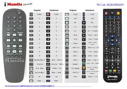 Este controle remoto executa todas as funções do controle remoto original: Power, 1, 2, 3, 4, 5, 6, 7, 8, 9, Resume/Return, Display, Disc Menu, System Menu, 0, Up, Down, Right, Left, OK, I<<, >>I, Play, Stop, Pause, Subtitle, Angle, Zoom, Audio, Repeat, A-B Repeat, Shuffle, Scan