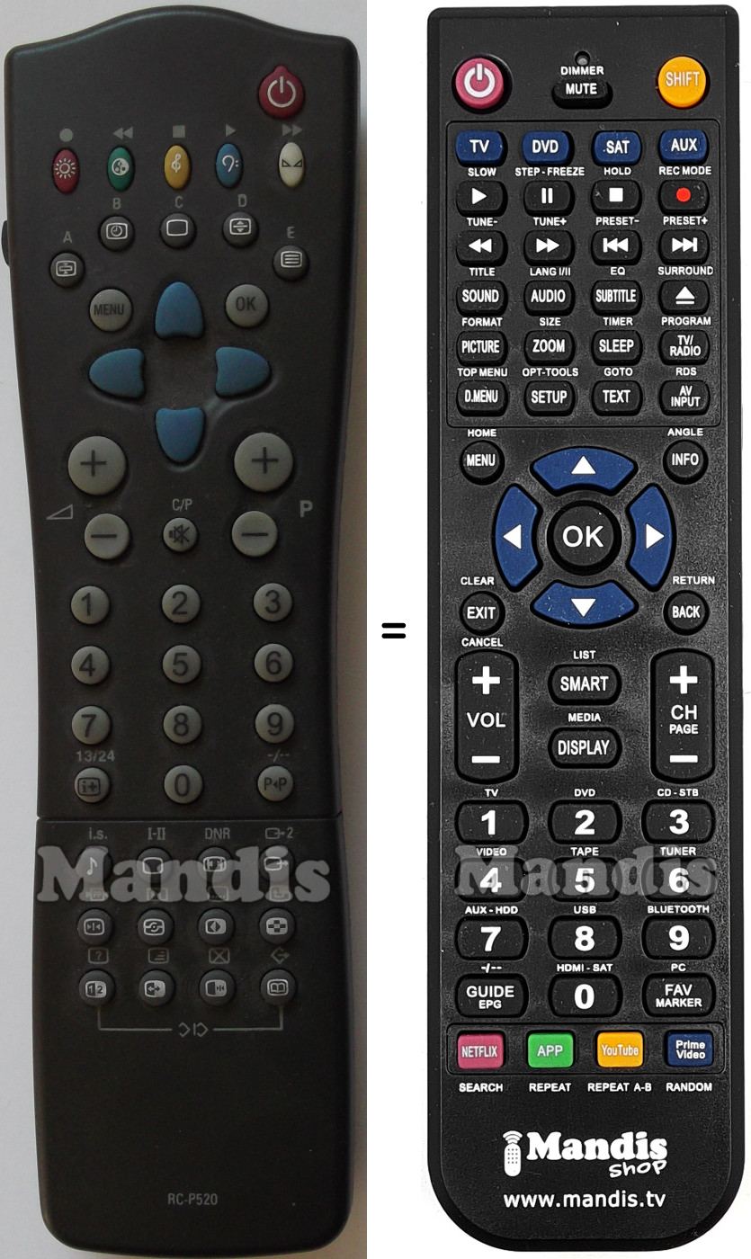 Abaixo, mostraremos a correspondência entre cada botão no controle remoto original e o botão que executa a mesma função no controle remoto de substituição. Em alguns casos, pode ser necessário pressionar a tecla SHIFT antes de pressionar outro botão para realizar determinadas ações. Essas funções adicionais geralmente não são amplamente utilizadas e são incluídas para facilitar o entendimento do controle remoto de substituição, ou porque o controle remoto original tem mais botões do que seu equivalente.