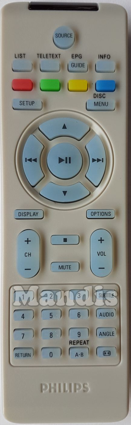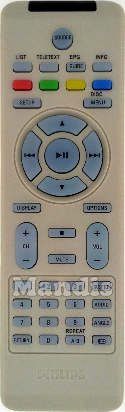 Source, List, Teletext, Guide / EPG, Info, Red, Green, Yellow, Blue, Setup, Disc Menu, Up, Down, Right / >>I, Left / I<<, Play / Pause, Display, Options, CH +, CH -, Stop, Vol +, Vol -, Mute, 1, 2, 3, 4, 5, 6, 7, 8, 9, 0, Return, Repeat A-B, Subtitle, Audio, Angle, Format