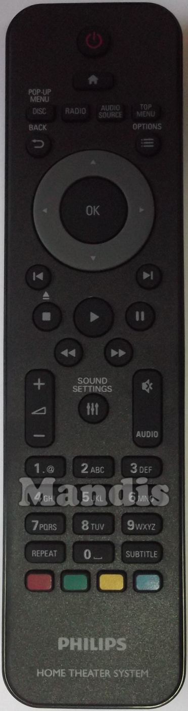 Power, Home, Disc/Pop-Up Menu, Radio, Audio Source, Top Menu, Back, Options, Up, Down, Right, Left, OK, I<, >I, Stop/Open/Close, Pause, Play, <<, >>, Sound Settings, Vol+, Vol-, Mute, Audio, 1, 2, 3, 4, 5, 6, 7, 8, 9, 0, Repeat, Subtitle, Red, Green, Yellow, Blue