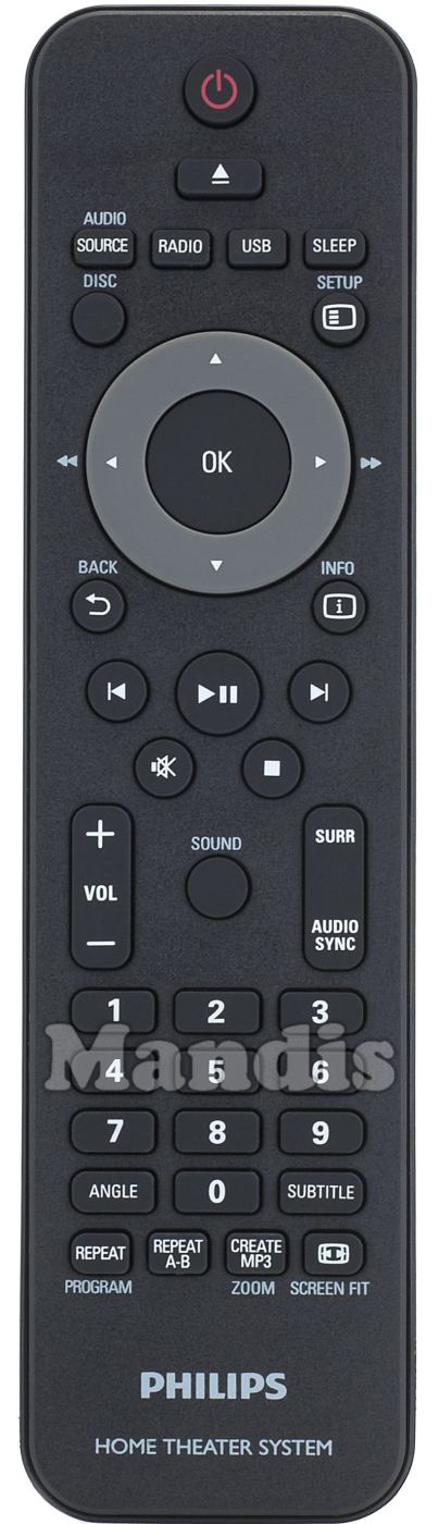 Power, Eject, Source/Audio, Radio, USB, Sleep, Disc, [= ]/Setup, Back, [i]/Info, OK, Up, Down, Right/>>, Left/<<, I<, >I, Mute, Stop, Play/Pause, Vol+, Vol-, Surr, Audio Sync, Sound, 1, 2, 3, 4, 5, 6, 7, 8, 9, 0, Angle, Subtitle, Repeat/Program, Repeat A-B, Create MP3/Zoom, [<>]/Screen Fit