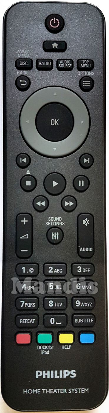 Power, Home, Disc / Pop-Up Menu, Radio, Audio Source, Top Menu, Back, Options, Up, Right, Down, Left, OK, I<, >I, Stop / Eject, Play, Pause, <<, >>, Vol +, Vol -, Sound Settings, Mute, Audio, 1, 2, 3, 4, 5, 6, 7, 8, 9, 0, Repeat, Subtitle, Red, Green / DOCK for iPod, Yellow / Help, Blue