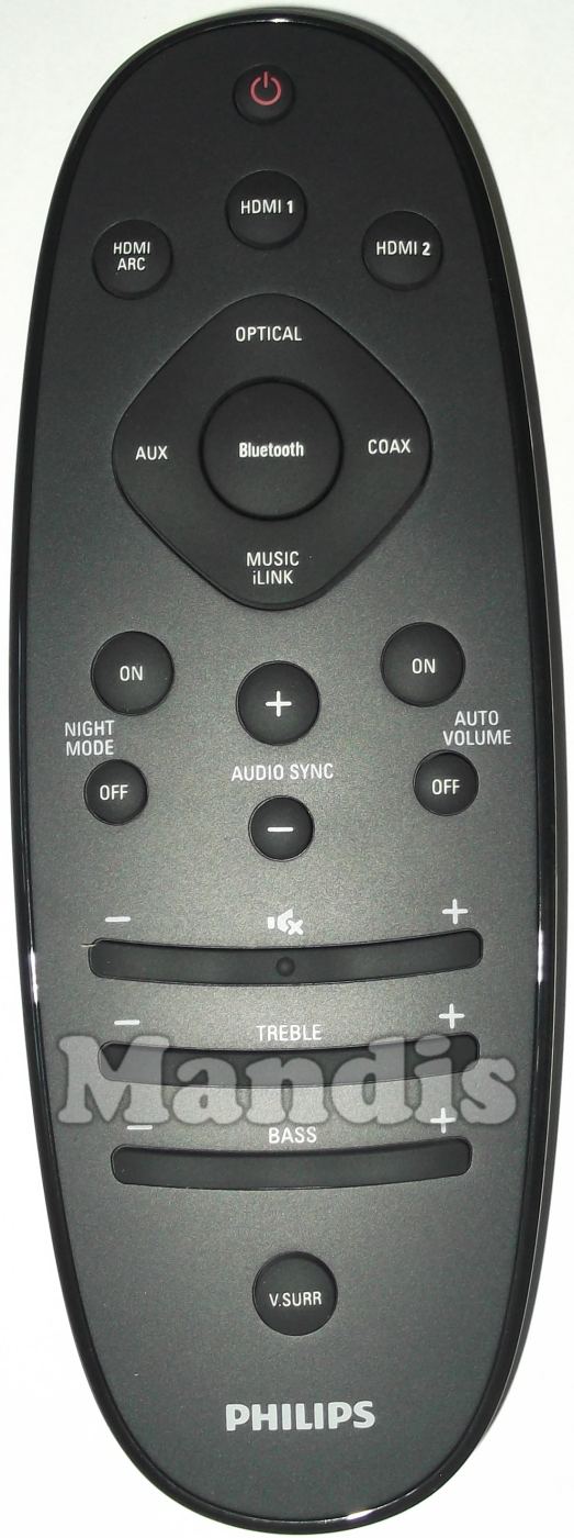 Power, HDMI ARC, HDMI 1, HDMI 2, Up / Optical, Right / Coax, Down / Music iLink, Left / Aux, OK / Bluetooth, Night Mode On, Night Mode Off, Audio Sync +, Audio Sync -, Auto Volume On, Auto Volume Off, Volume -, Mute, Volume +, Treble -, Treble +, Bass -, Bass +, V.Surr
