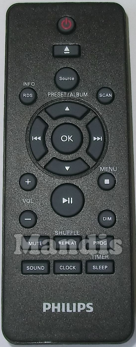 Power, Eject, Source / Preset / Album, RDS / Info, Scan, Up, Down, Right / >>I, Left / I<<, OK, Vol +, Vol -, Play / Pause, Stop / Menu, DIM, Mute, Repeat / Shuffle, Prog, Sound, Clock, Sleep / Timer