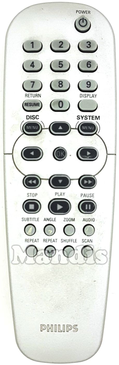 Power, 1, 2, 3, 4, 5, 6, 7, 8, 9, 0, Resume / Return, Display, Disc Menu, System Menu, Up, Left, OK, Right, Down, <¡I<<, >>I, Stop, Play, Pause, Subtitle, Angle, Zoom, Audio, Repeat, Repeat A-B, Shuffle, Scan