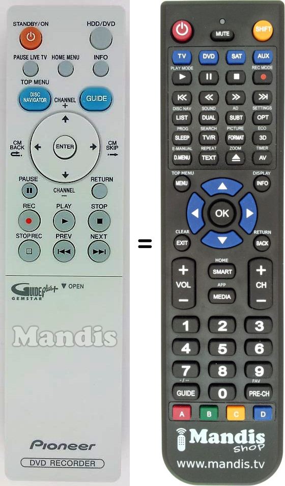 Abaixo, mostraremos a correspondência entre cada botão no controle remoto original e o botão que executa a mesma função no controle remoto de substituição. Em alguns casos, pode ser necessário pressionar a tecla SHIFT antes de pressionar outro botão para realizar determinadas ações. Essas funções adicionais geralmente não são amplamente utilizadas e são incluídas para facilitar o entendimento do controle remoto de substituição, ou porque o controle remoto original tem mais botões do que seu equivalente.